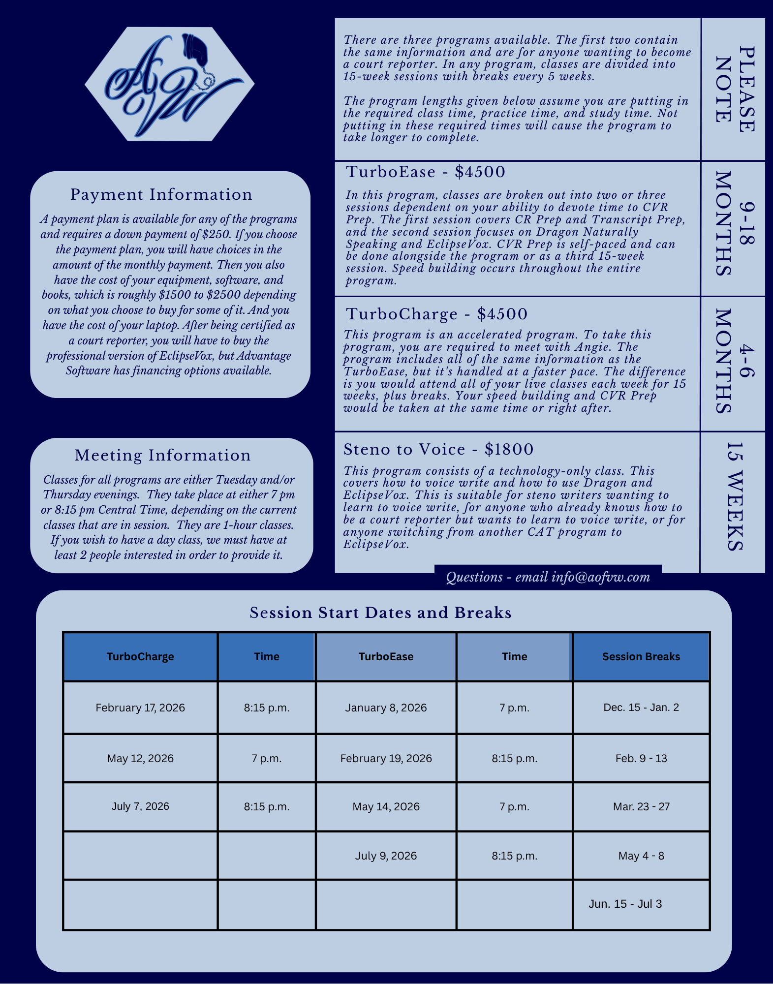 Open Enrollment for January Start ends December 15, 2025, for TurboEase applicants.Open Enrollment for February Start ends February 2, 2025, for TurboCharge and Voice-to-Steno applicants.(Note: Clicking "Apply Now" will give more program information and allow you to enroll for other future start dates)Programs and their information are located here.